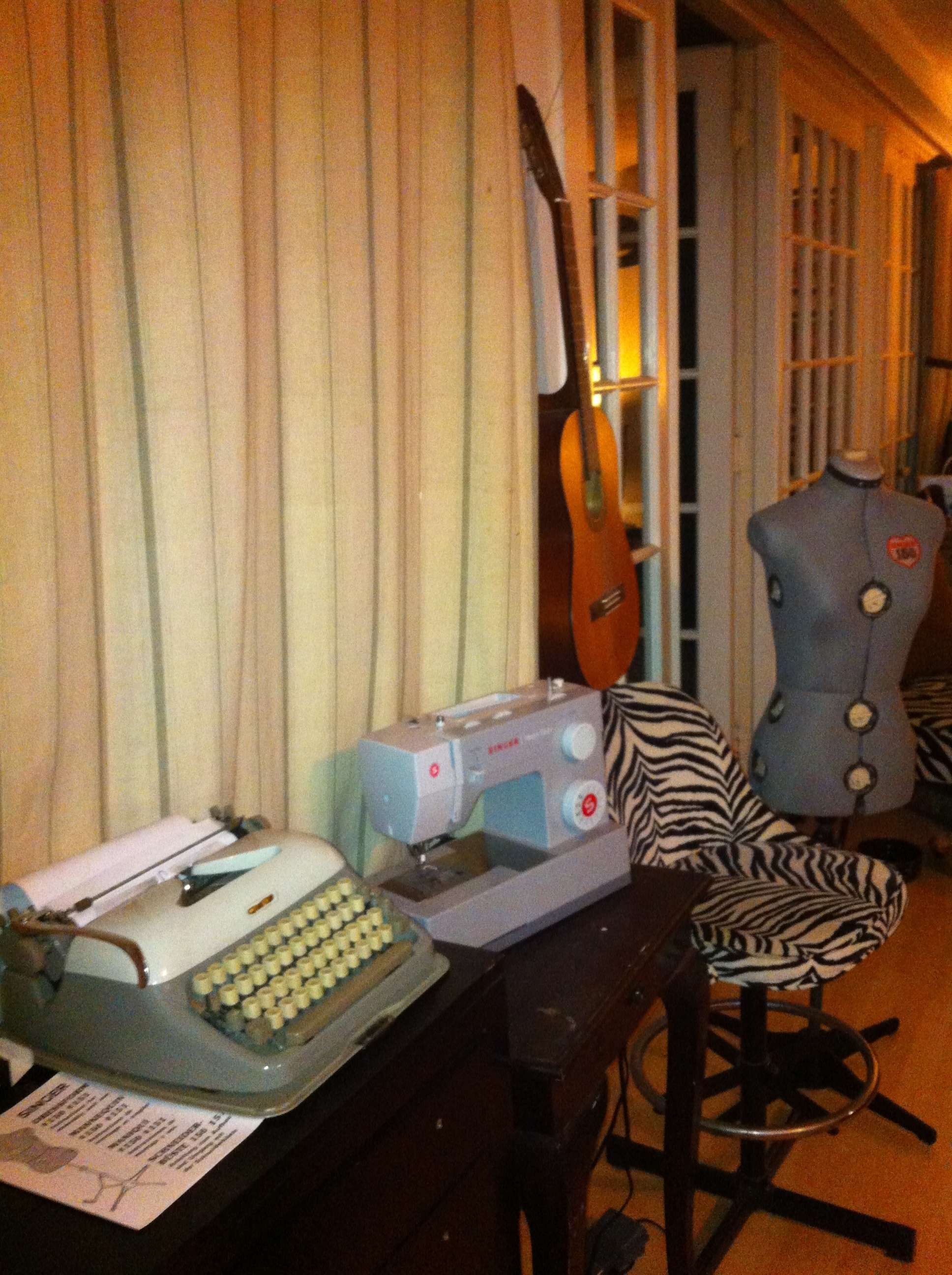 Since I’m at my boyfriend’s place in Hancock Park, Ca more than 90 percent of the time we decided living together, although a bit scary, is only logical. We spent the better part of today moving my things out of my beloved apartment in Venice and into his. Commingling our possessions so we both have our own corners to work in comfortably wasn’t easy; unfortunately, it meant giving up my prized sewing table. However, I’m thrilled with how it turned out! Mine that is, as we are still working the kinks out of his. My sewing machine, bodice, type-writer and guitar have all lined up nicely, and I can’t wait to get back to work.